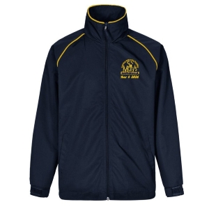 Description: Light weight jacket with contrast raglan sleeves and piping on collar and sides. Two side pockets. Front zipper.